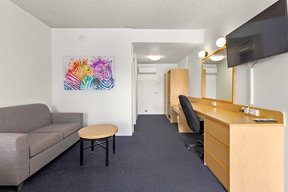 This room has a queen-sized bed, reverse-cycle air-conditioning, a mini-bar, free WiFi, complimentary tea and coffee and a flat-screen Smart TV. There is a lounge chair, work desk and a separate refurbished private bathroom with a walk-in shower, free toiletries and a hairdryer.
